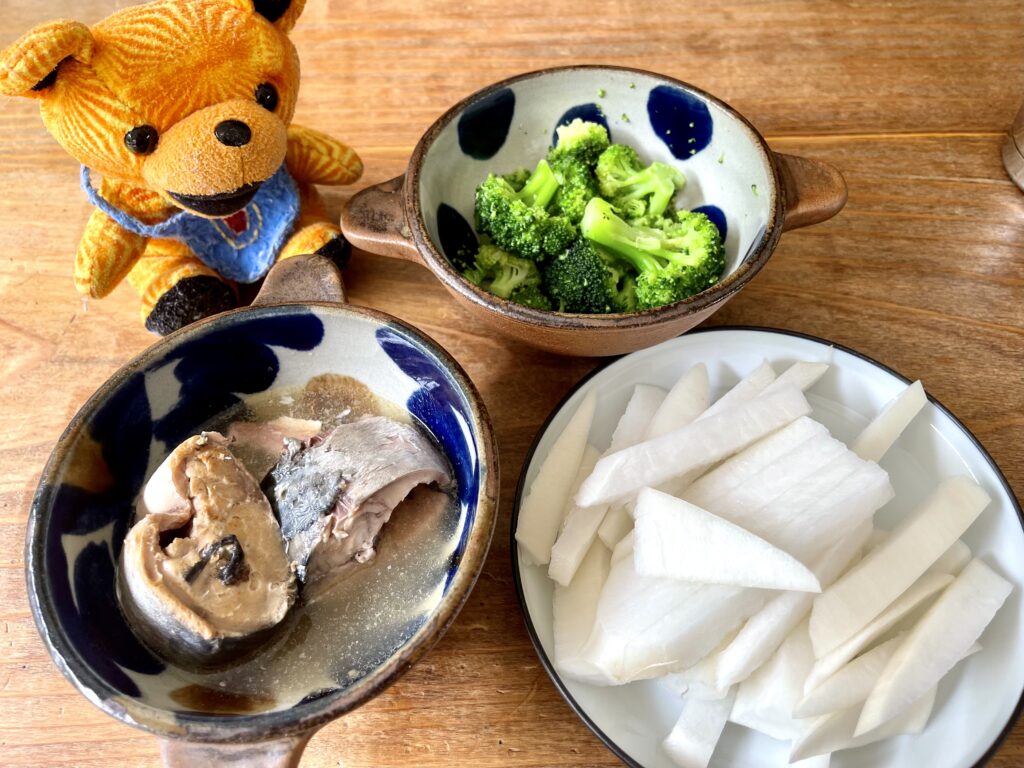サバ缶、大根、ブロッコリーw