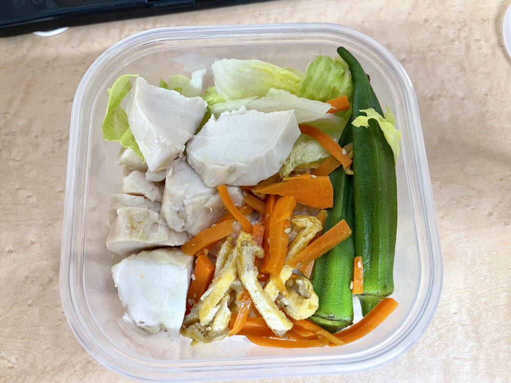 ご飯80gぐらいに鶏むね肉を130gぐらい。あとは適当に野菜少々。