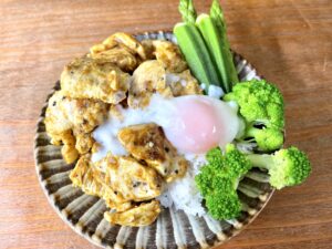 鶏胸肉のソテーカレー味をご飯に乗せたプレートです。